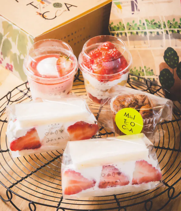 当農園で収穫したフルーツ・加工品(テイクアウトスイーツ、ジャム等)を直売しています。見た目も可愛いギフトボックスをご用意しており、スタッフ厳選フルーツやスイーツを愛情をもってお詰めします。 ご家庭用や大切な方への贈り物にどうぞ!